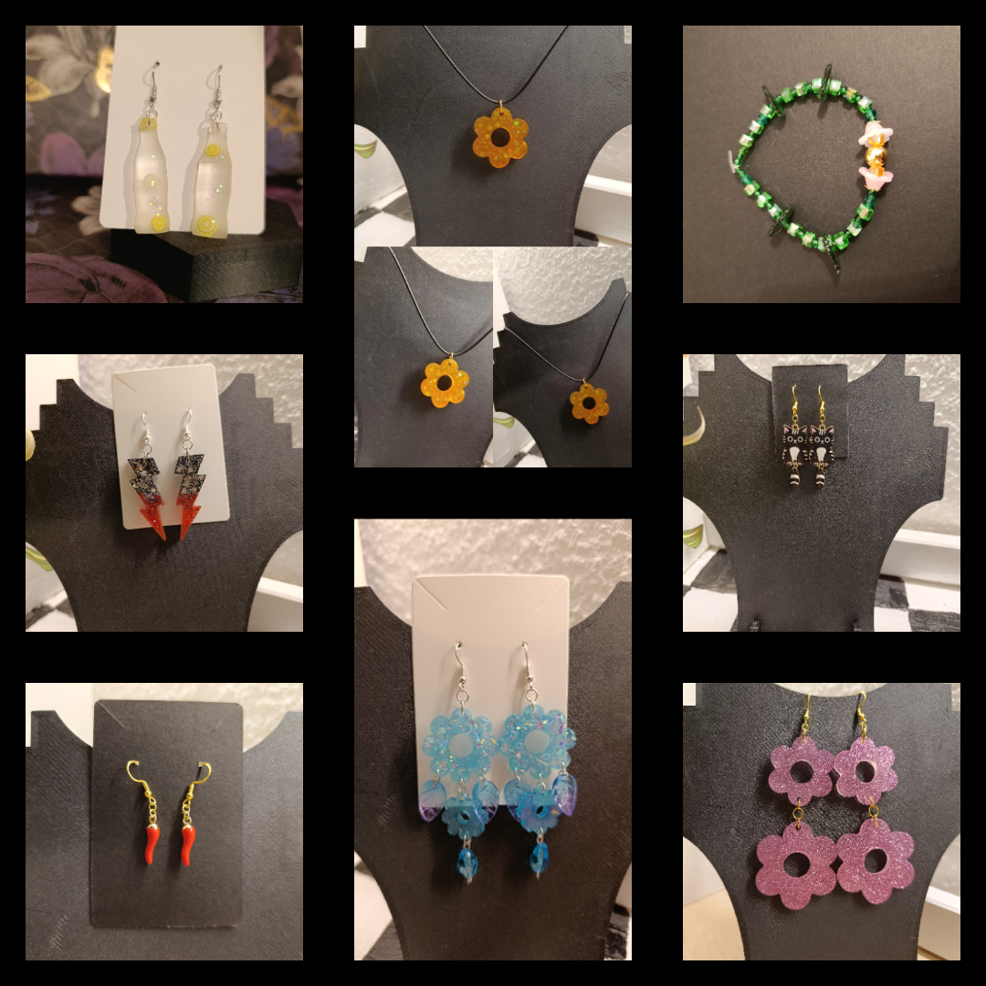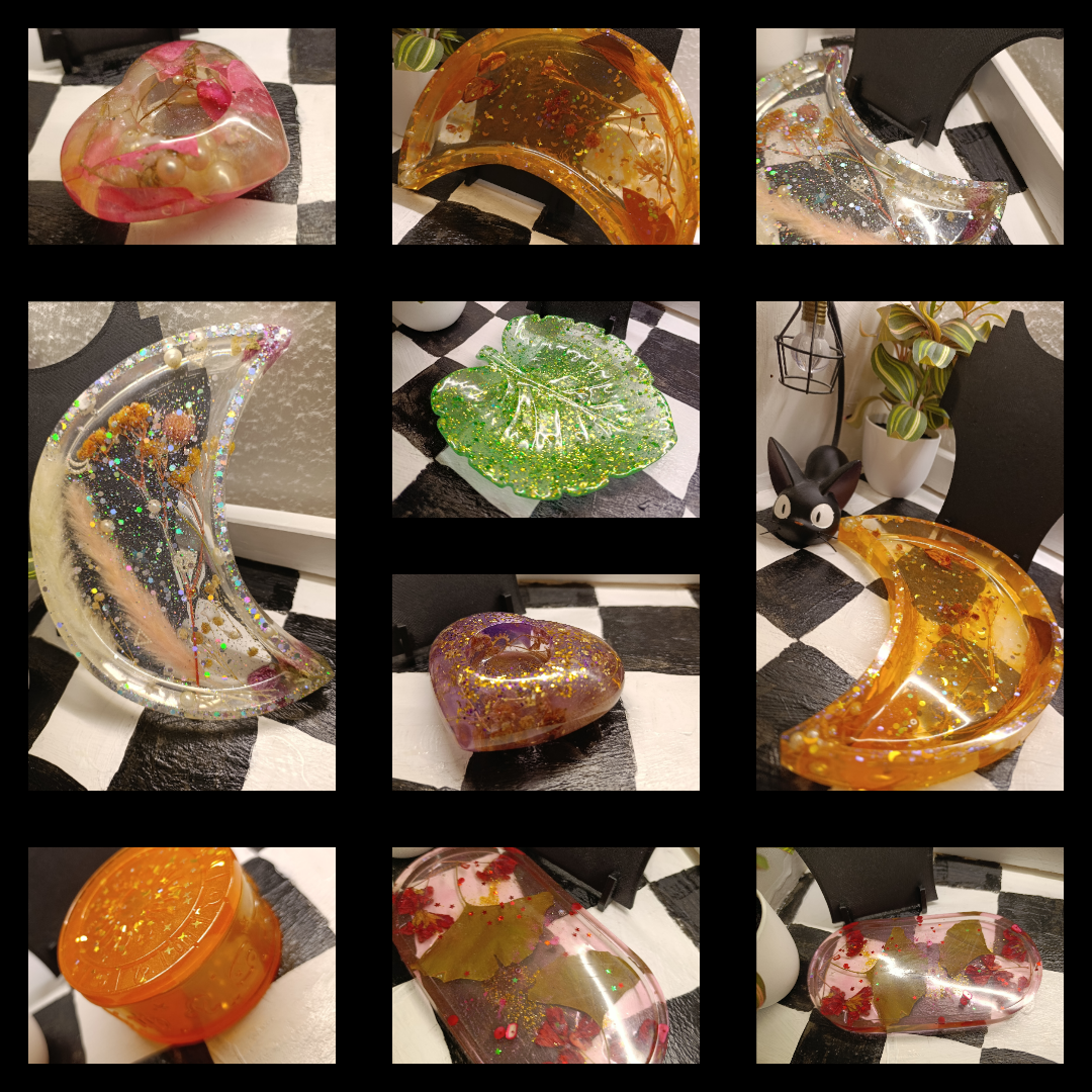 Handmade jewellery, candle holders, jewelry dishes, keychains, figures and more crafted from epoxy resin, pearls, dried flowers, and more & with stainless steel.