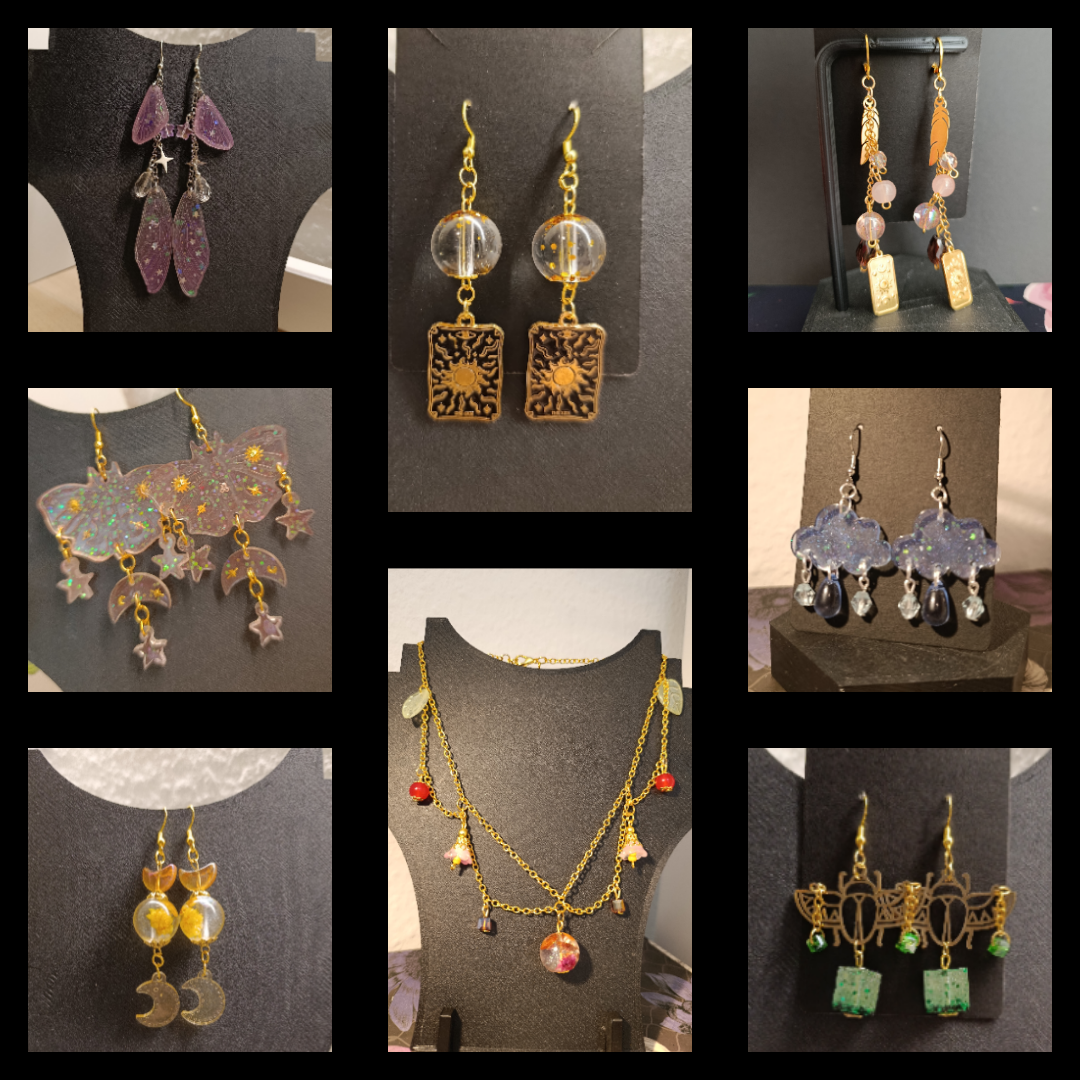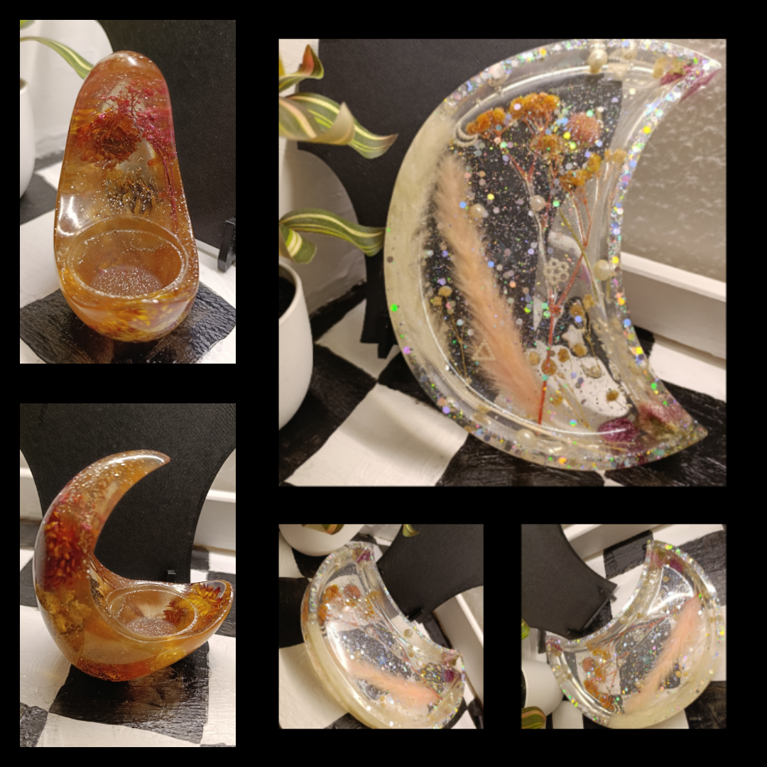 Handmade jewellery, candle holders, jewelry dishes, keychains, figures and more crafted from epoxy resin, pearls, dried flowers, and more & with stainless steel.